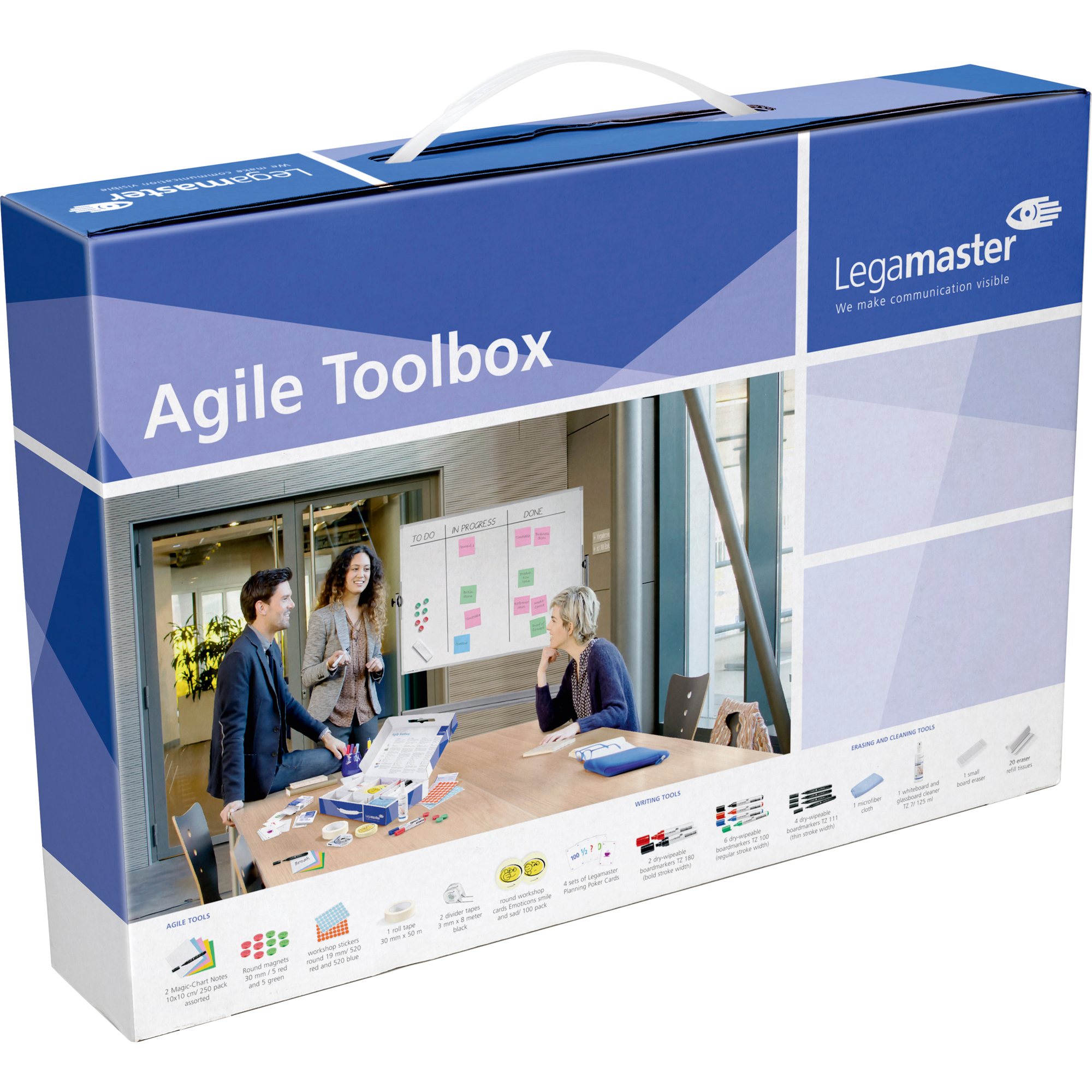 Praktisches Komplettset mit allem was Sie für agiles Projektmanagement und Workshops benötigen. Verwandelt jedes Whiteboard im Handumdrehen in ein Scrum-, Kanban- oder Canvas-Board. Inhalt: 2 x Magic-Chart Notes 10 x 20 cm (farbig sortiert), Markierungspunkte rund 19 mm (je 520 x rot, blau), Magneten rund 30 mm (je 5 x rot, grün), 2 x Aufteilungsband 3 mm x 8 m (schwarz), 200 Moderationskarten Emoticons (je 100 x lachend, traurig), 6 x magnetische Emoticons (je 2 x lächelnd, traurig, neutral),1 Rolle Tape 30 mm x 50 m, 1 Set Legamaster Planning Pokerkarten für 4 Anwender, 2 Boardmarker TZ 180 dicke Strichbreite (je 1 x schwarz, rot), 6 Boardmarker TZ 100 mittlere Strichbreite (3 x schwarz, je 1 x rot, grün, blau), 4 Boardmarker TZ 111 dünne Strichbreite (schwarz), 1 Mikrofasertuch, 1 Reinigungsspray TZ 7 (125 ml), 1 kleiner Whiteboard-Löscher, 20 x Löschpapier zum Nachfüllen.